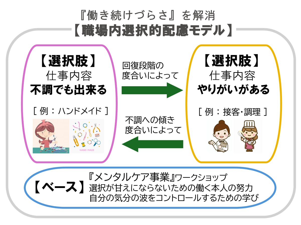 『働き続けづらさ』は、【飲食事業:カフェ】を加え【物販事業:ハンドメイド&ギフトショップ】と回復度合いや不調への傾き度によって選択できる職場環境を作ることで解消したいと考えています。