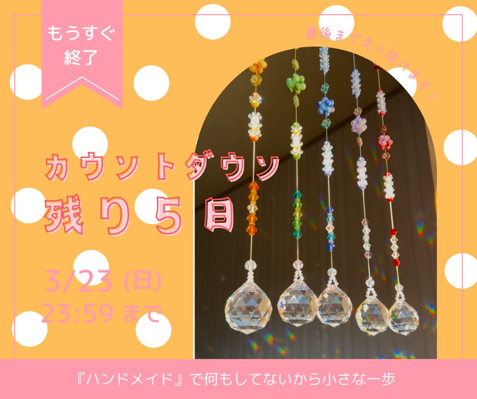 残り1週間!終了まで180時間切りました!55名の方にご支援を頂きありがとうございます。お一人お一人のお気持ちがとっても嬉しいです★以下、51~55人目のご支援者様のメッセージを紹介します。本当に皆様ありがとうございます(*^-^*)sanikura様応援しています!頑張ってください!応援が力になります!ありがとうございます(*^▽^*)guest64a692ce6a様沢山色んなチャレンジしていて本当に凄い!!ずっと応援してます!何かお手伝いできることもあれば。。お互い夢に向かって頑張ろうーっ!いつもありがとうございます(*^-^*)頼りにしてます♪お互いがんばりましょう★user_81b6bf5f45d4様頑張ってください!遠くから応援とっても嬉しいです(^o^)頑張ります★user_0197f672b274様応援しています!ワークショップも、楽しみにしています。追加でご支援くださりありがとうございます!!ワークショップ『らぼ おどうぐばこ』の参加とってもとっても嬉しいです♪お会いできるのを楽しみにしてます★user_852f96d6f6b4様応援しています!頑張ってください!虹色に輝くサンキャッチャー素敵ですね☺楽しみです!!ありがとうございます!ワークショップのご参加嬉しいです★世界に1つだけのオリジナルデザインを楽しみにしてます(*^▽^*)♪より多くの方に『思い』が届きますよう、ページのシェア等、よろしくお願いいたします。ページはこちらから▼https://camp-fire.jp/projects/816671/viewお気に入りの登録もお願いします(*^^*)