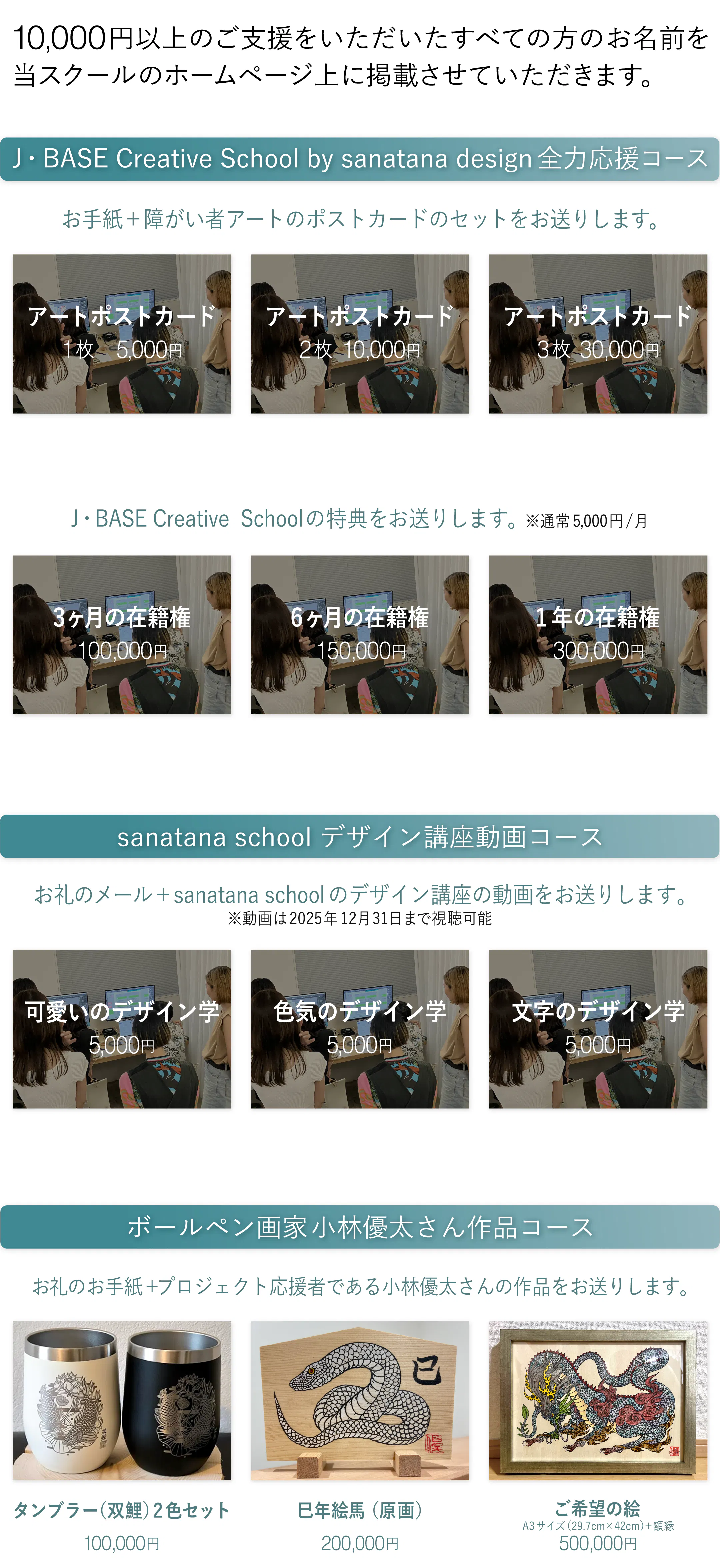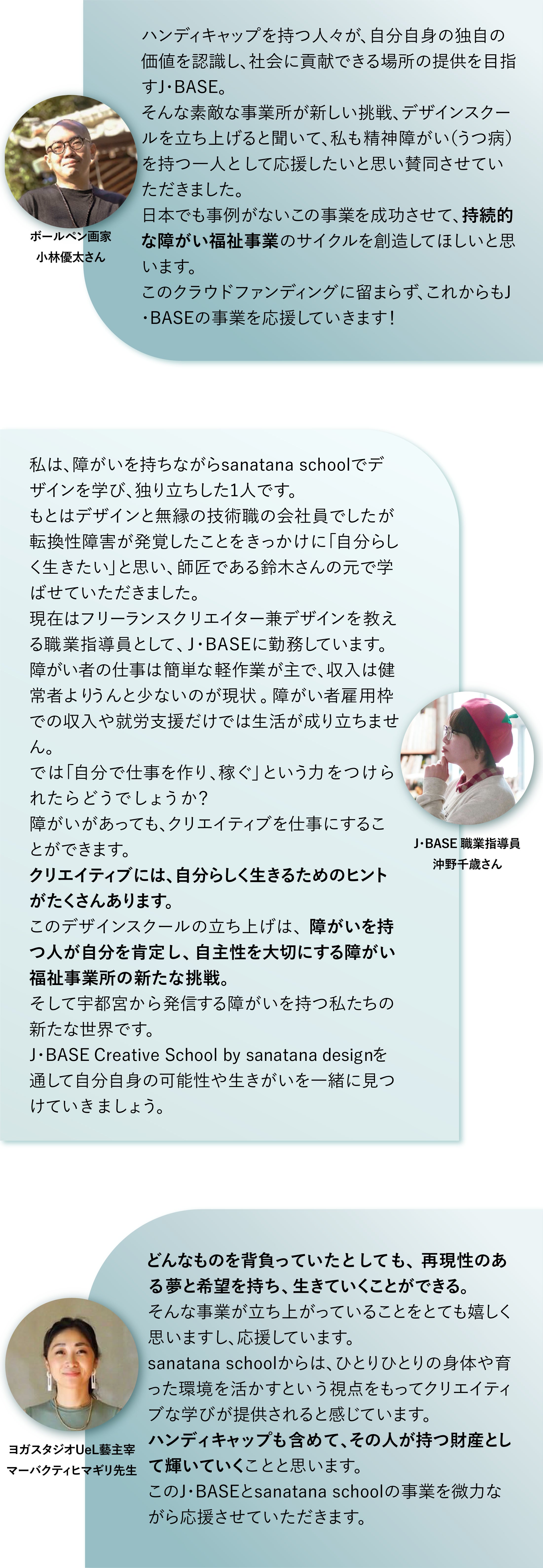 障がいがあっても「自分で稼いで自分らしく生きる」という強いマインドを持って人生を歩んでいただきたい。そのきっかけとなる学びを、この【J・Base Creative School by sanatana design】から始めます。 みなさまのご支援をどうぞよろしくお願いいたします。
