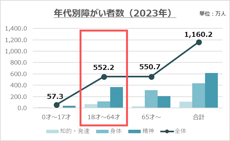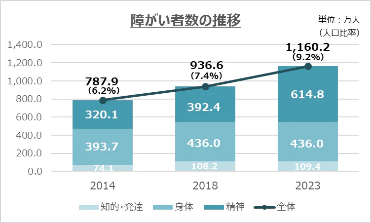 障がい者数(特に精神障がい者)は、ここ十数年で増加傾向にあり、2023年時点で1,100万人超。