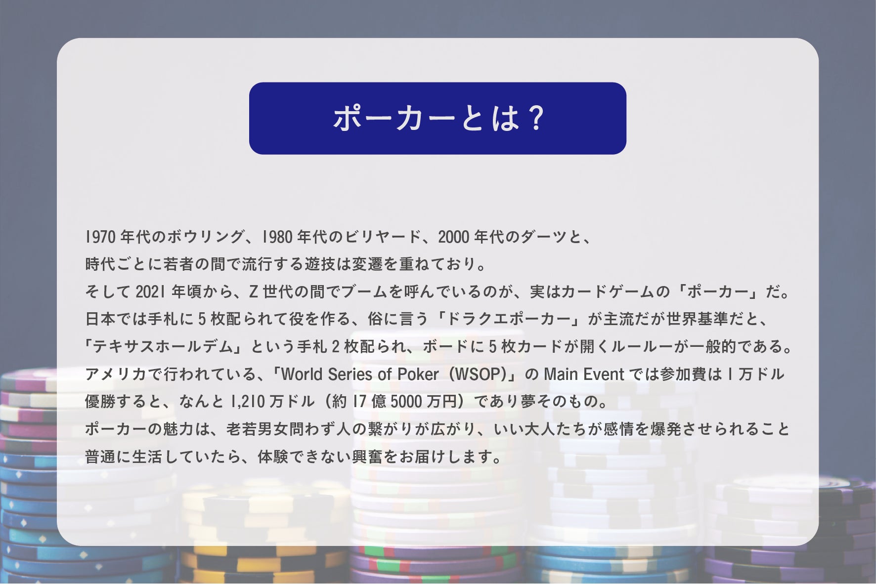 私が届けたいのは、ポーカーだけではなくそこにいる人たちとさらに自然と打ち溶け合えるリラックスできる時間。