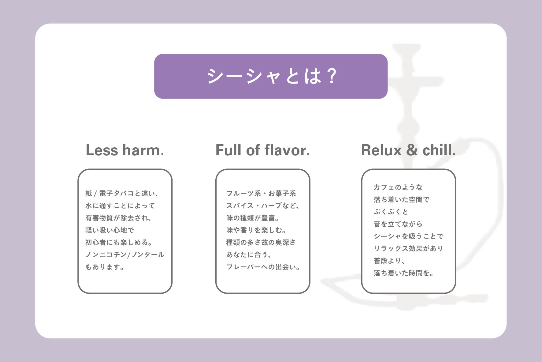 日本に帰国している際に東京でシーシャに出会い、その心地良さやリラックス効果。シーシャの奥深さに感動を覚える。