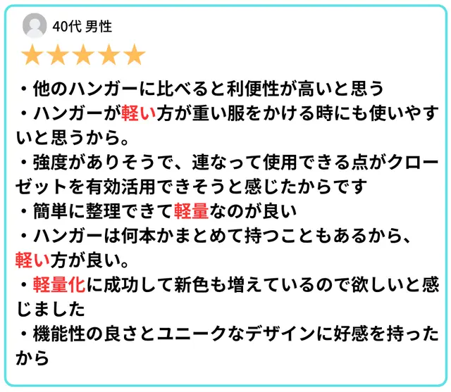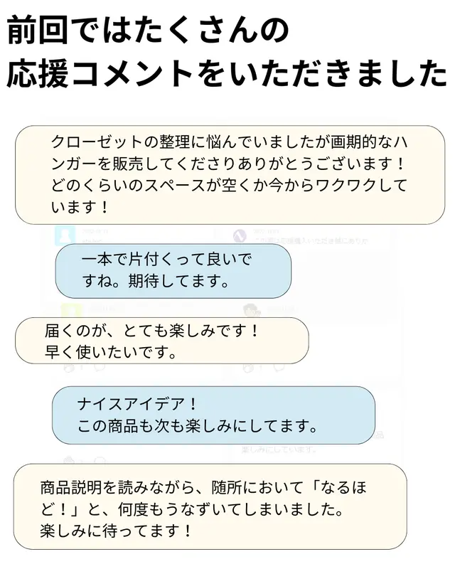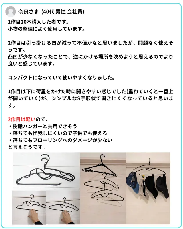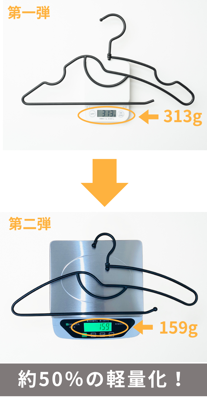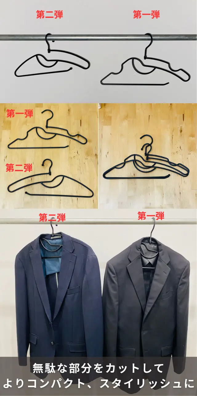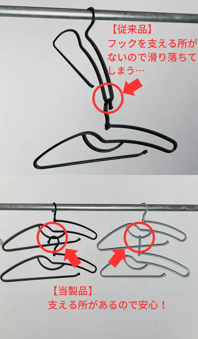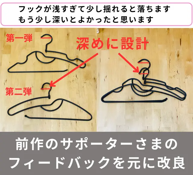 こちらの商品はハンガーに対するお悩みを解消できればいいなと思い、試行錯誤を重ねて複数回のサンプル開発を取り組んだのちに誕生しました。