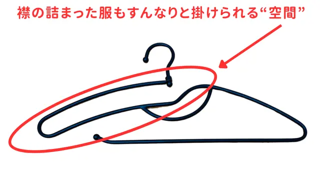 この空間があるから、トレーナーやTシャツなど襟の詰まった衣類でも首元を伸ばさずに掛けられます!
