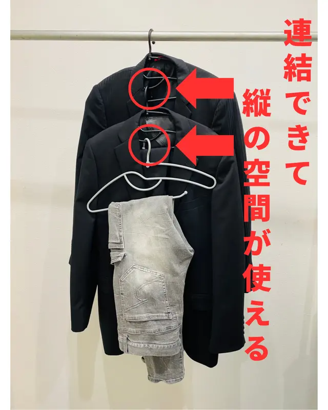 このハンガーは、フレームにフックを引っかけて縦に連結できるので収納スペースを大幅に増やせます。