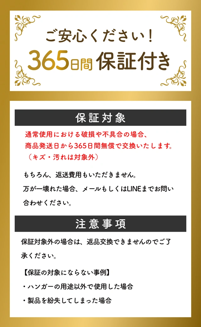 もし製品に欠陥等の不備があった場合、商品発送後365日以内であれば交換の対応を致します。