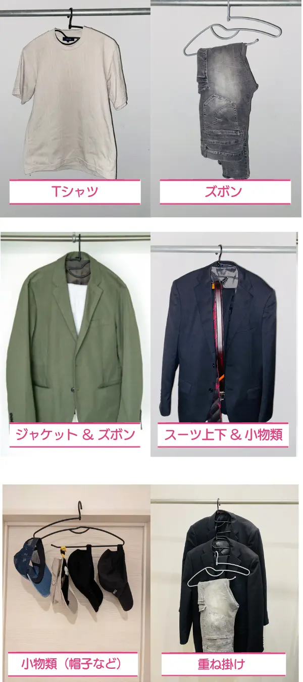 など、お気に入りの服を自由に組み合わせて掛けられます。