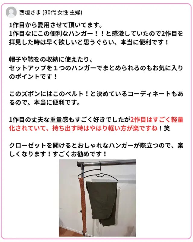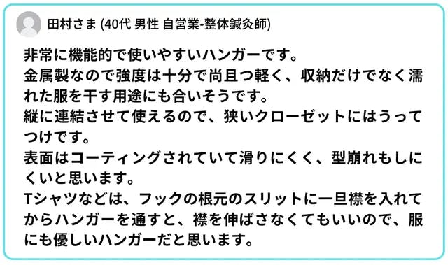 こちらの商品はハンガーに対するお悩みを解消できればいいなと思い、試行錯誤を重ねて複数回のサンプル開発を取り組んだのちに誕生しました。