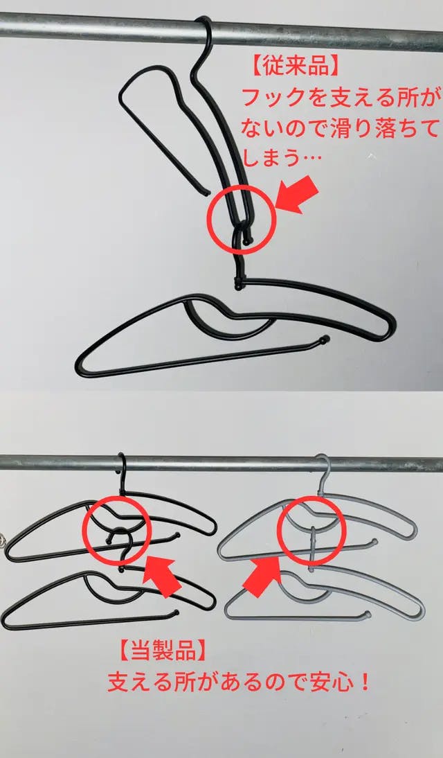 この空間があるから、トレーナーやTシャツなど襟の詰まった衣類でも首元を伸ばさずに掛けられます!