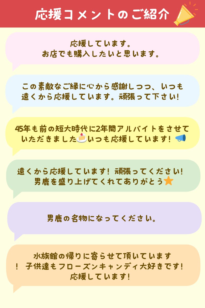 今回は、地元の方からたくさんのメッセージをいただいています。ぜひ、男鹿や近くに来た際には、お店にお立ち寄りください!また、遠くからの応援も届いています。男鹿の名物として、多くの人に知ってもらえるようにこれからも頑張っていきます!中には、45年前の学生さんからも嬉しいコメントも!