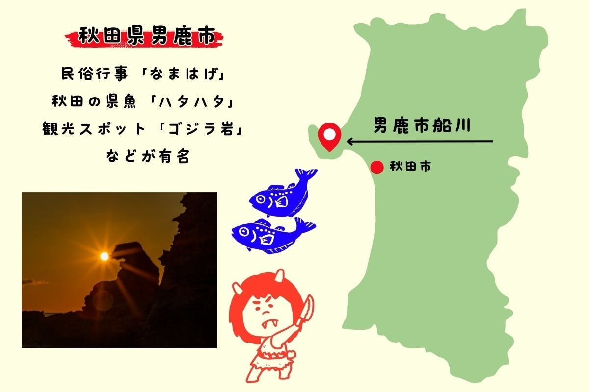 ゴンタロー製菓は、秋田県の特徴的な出っ張りの部分にあたる男鹿市にあります。なまはげの里・男鹿では、秋田の県魚である「ハタハタ」が漁獲され、「寒風山」や「ゴジラ岩」は秋田で有名な観光スポットです。