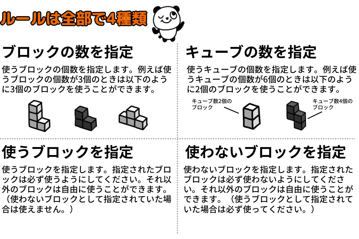 ルールは全部で4種類あり、全てを満たすようにブロックを配置する必要があります。