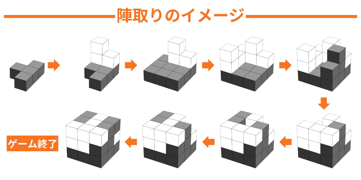 交互に、3×3×3の立方体になるようにブロックを重ねていき、立方体が完成するか、黒ブロック・白ブロックともに置く場所がなくなったらゲーム終了です。