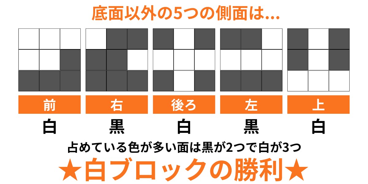 ゲーム終了時に底面以外の5つの側面について、「占めている色が多い面」が多い方が勝ちとなります。