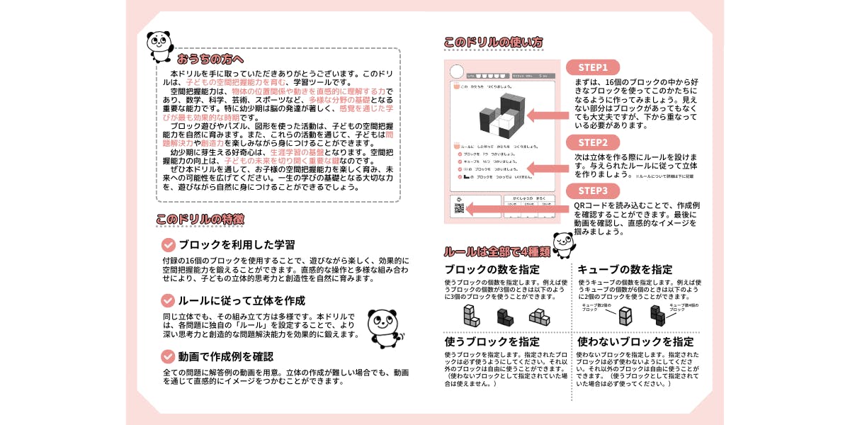 『パンダブロック』では、ドリルと一緒にドリルで使用する黒と白の計16個のブロックが付録されています。