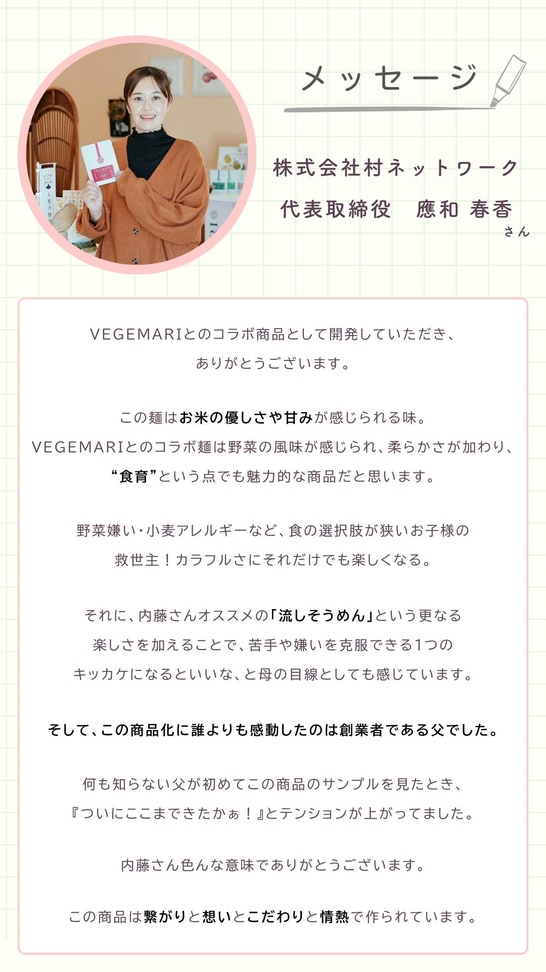 そのVEGEMARIを製造する株式会社村ネットワークの代表取締役 應和春香 さんより、今回のプロジェクトへメッセージをいただきました!