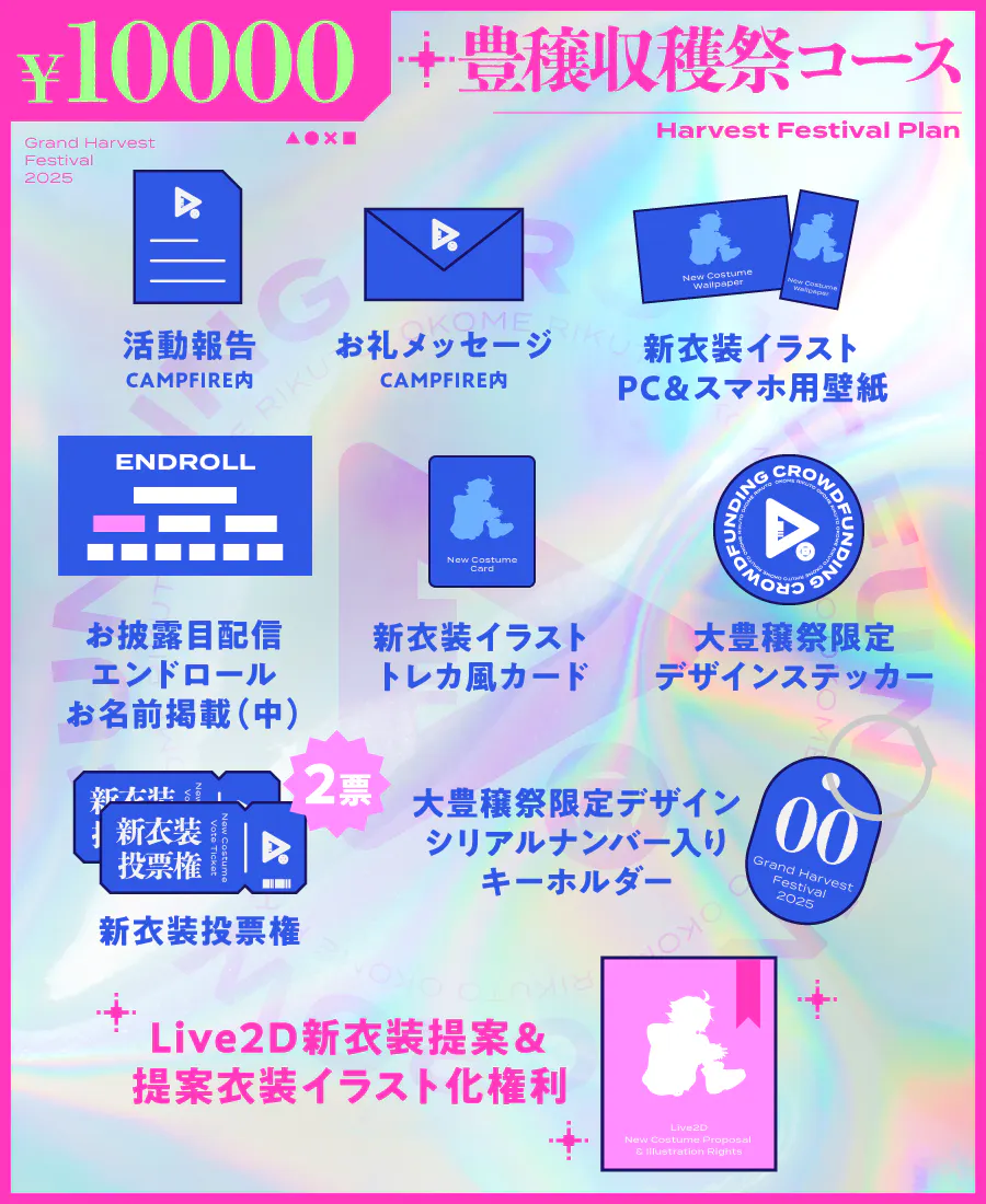 今回の『大豊穣祭』は、クラウドファンディングを通じて皆さんから新衣装のアイデアを募集し、その中から投票で選ばれた衣装を実際の新衣装として制作します。