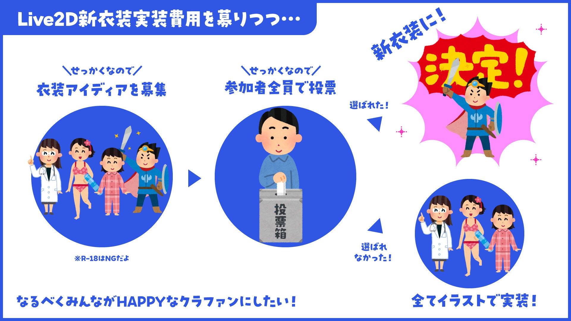 ただの新衣装クラファンには留まらず、1年を通じて皆さんと一緒に長く楽しめる企画にすることが目標です!少し風変わりなクラファンではございますが、ぜひお祭りイベントとして楽しんでいただけると嬉しいです!!