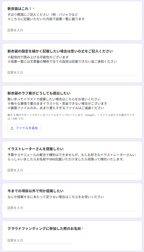 10000円以上のコースにご参加いただいた場合のみ別途お送りいたしますGoogleフォームにて新衣装をご提案いただきます。