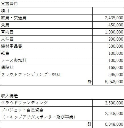 ・下記金額の一部金額は、RTA協賛金、RTAの自己資金、参加者(選手)自己負担金にて充当致します。