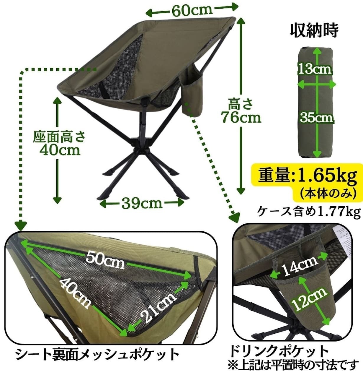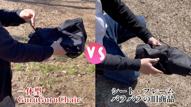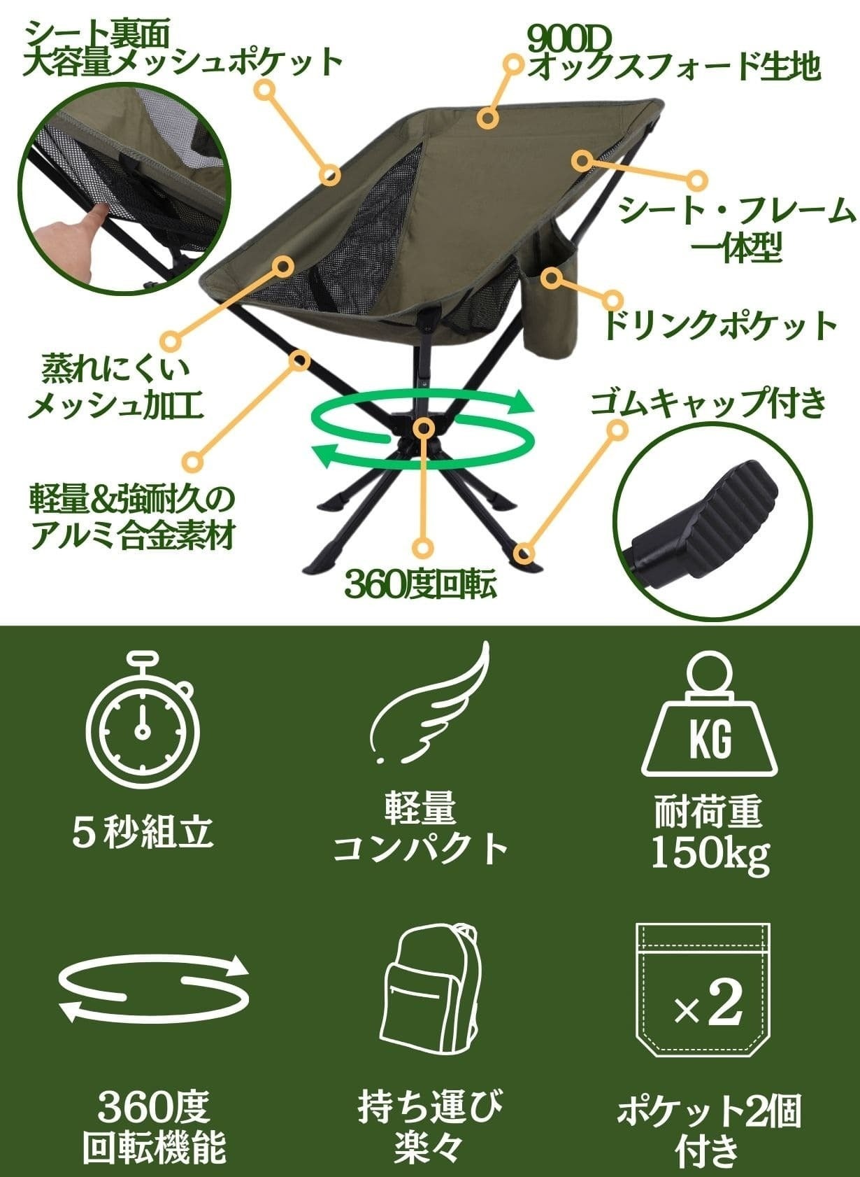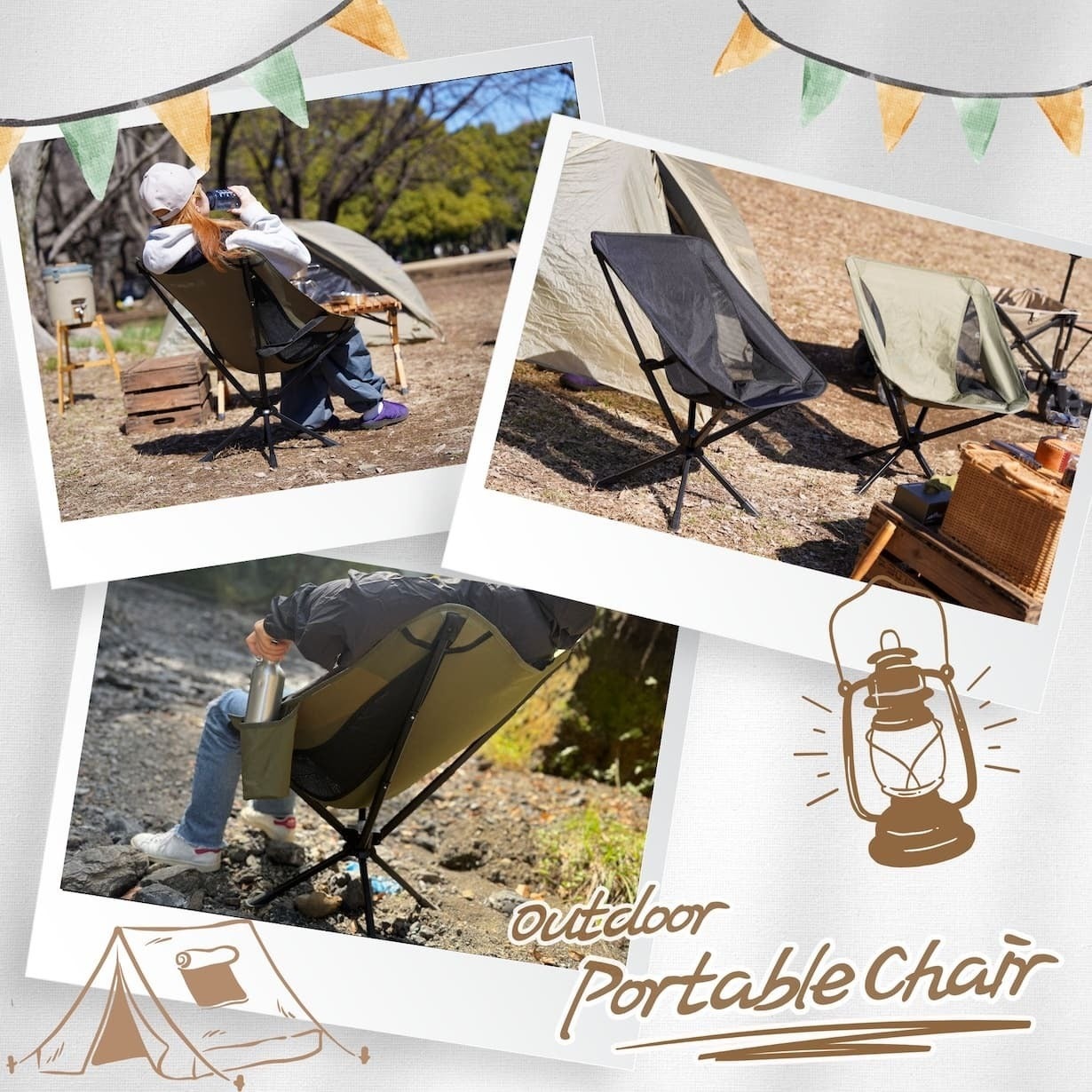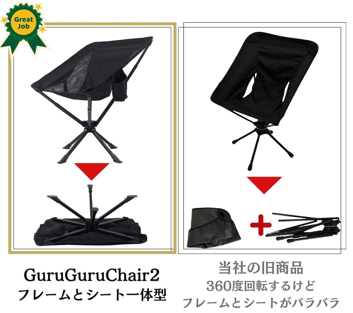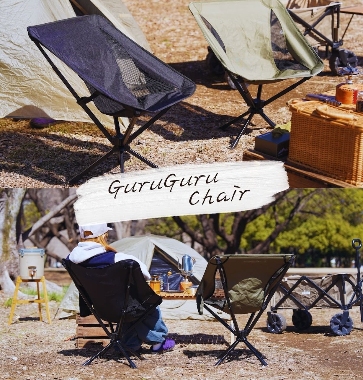 今回ご紹介する「GuruGuruChair 2」は、ポータブルチェアに求められる『コンパクトさ』と『座り心地』に加え、『360度回転機能』、便利な『ドリンクホルダー』と『大容量ポケット』を備えた、革新的な折りたたみ式チェアです。