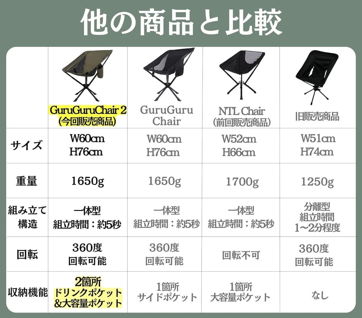 2025/11/27 21:00こんばんは、Woodbaseの菅原です。いつも当社の商品を応援してくださり、本当にありがとうございます。本日は、すでにWoodbaseの商品をご購入いただいた皆さま、そして過去にお気に入り登録してくださった皆さまに向けて、ぜひご紹介したい新作アイテムがあります。それが新モデル 「GuruGuru Chair 3」 です。https://camp-fire.jp/projects/877586/view⸻◎ わずか5秒でセット完了フレームとシートが一体化しているため、袋から出して“広げるだけ”で設営が完了。面倒な組み立てが一切なく、すぐに座れる快適さが大きな魅力です。◎ 360°回転で驚くほど便利に焚き火の向きを変えたいとき、荷物を取るとき、写真を撮りたいとき…椅子を持ち上げたり動かしたりする必要がなく、座ったままスムーズに方向転換できます。前作に続き、この「動ける快適さ」がユーザーから特に好評です。◎ コンパクトなのにしっかり安定軽量&持ち運びやすいサイズ感なのに、体をあずけたときの安定感が高く、長時間座っても疲れにくい設計。「見た目以上に座り心地が良い」という声も多く届いています。◎ 新搭載のドリンクホルダーが便利多くのご要望に応えて、今回はドリンクホルダーを追加。飲み物やスマホを手元に置けることで、使い勝手が大幅に向上しました。⸻現在、CAMPFIRE(マチヤ)にて販売中ですが、プロジェクトは残り3日となりました。Woodbaseの商品を気に入ってくださっている皆さまにこそ、ぜひ一度使っていただきたい一脚です。気になる方は、この機会にぜひご覧ください。▼GuruGuru Chair 3https://camp-fire.jp/projects/877586/viewいつも応援いただき、心より感謝しております。今後ともどうぞよろしくお願いいたします。 もっと見る