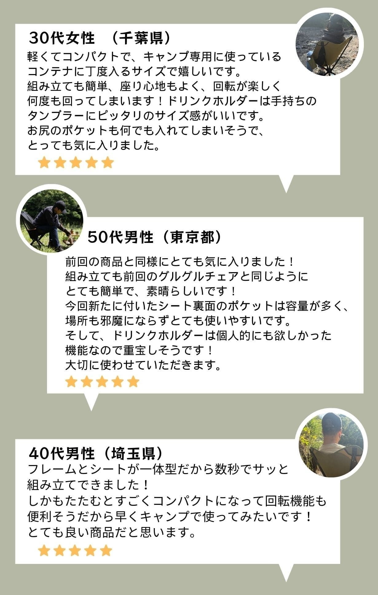 ポータブルアウトドアチェア「GuruGuruChair2」の試作品をお試しいただき、高評価をいただきました。(抜粋、一部修正)