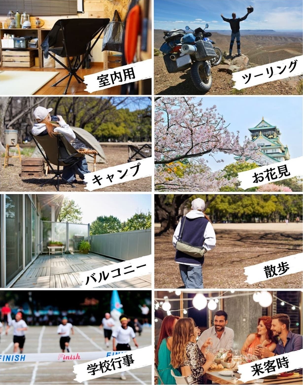 キャンプやBBQなどの野外はもちろん、室内での使用や、コンパクトに収納できるので来客時の椅子としてもおすすめです!