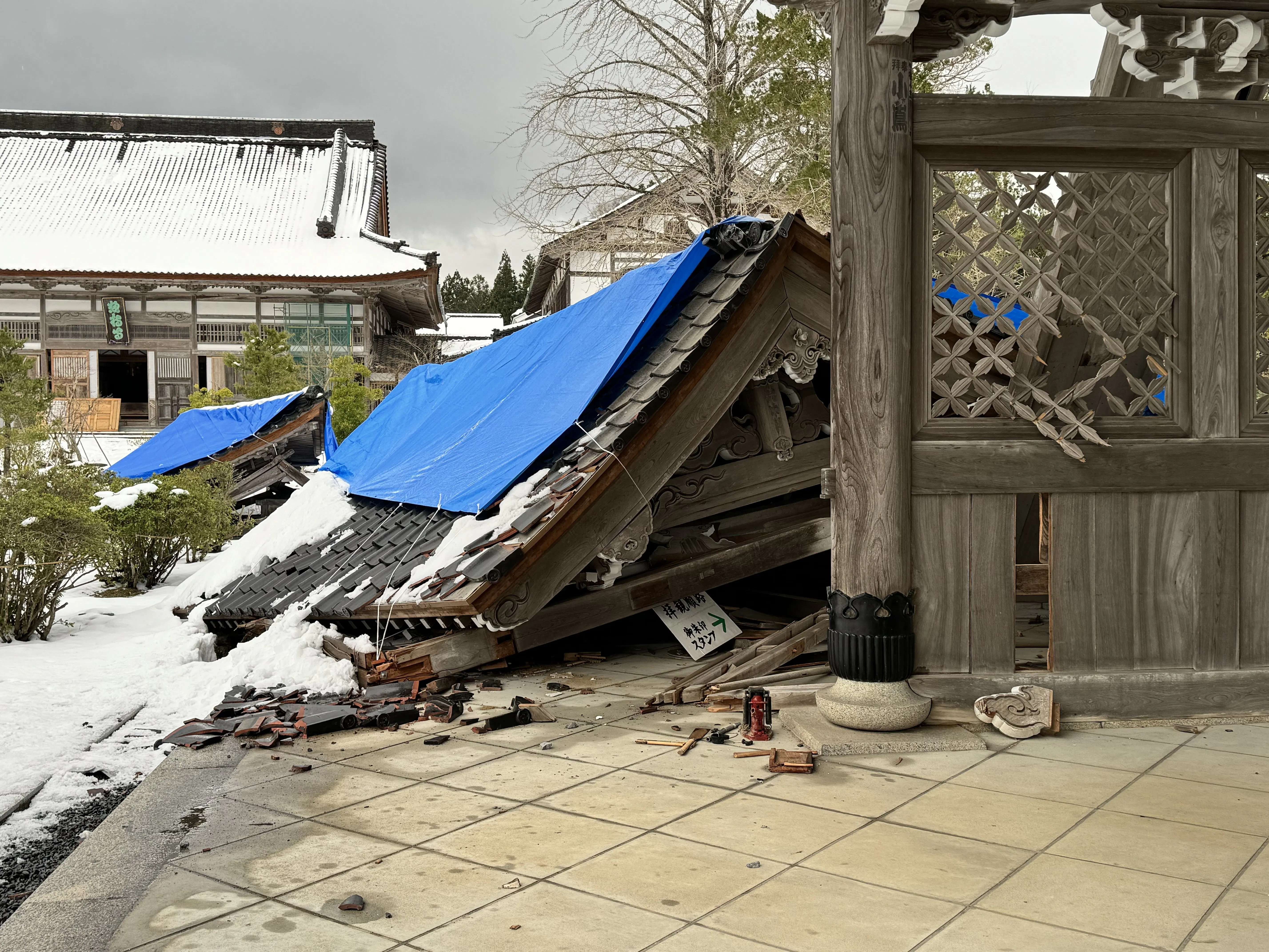 地震で倒壊した建物(昨年1月・門前町にて)平成19年の能登半島地震で大きな損害を受け、十数年かけて再建した総持寺祖院(そうじじそいん)はまたしても無惨な姿に…。コロナ禍も沈静化し、総持寺を開かれた瑩山禅師(けいざんぜんじ)700回忌という大きな行事を控えた中での地震発生、関係者の無念さを思うといたたまれません。