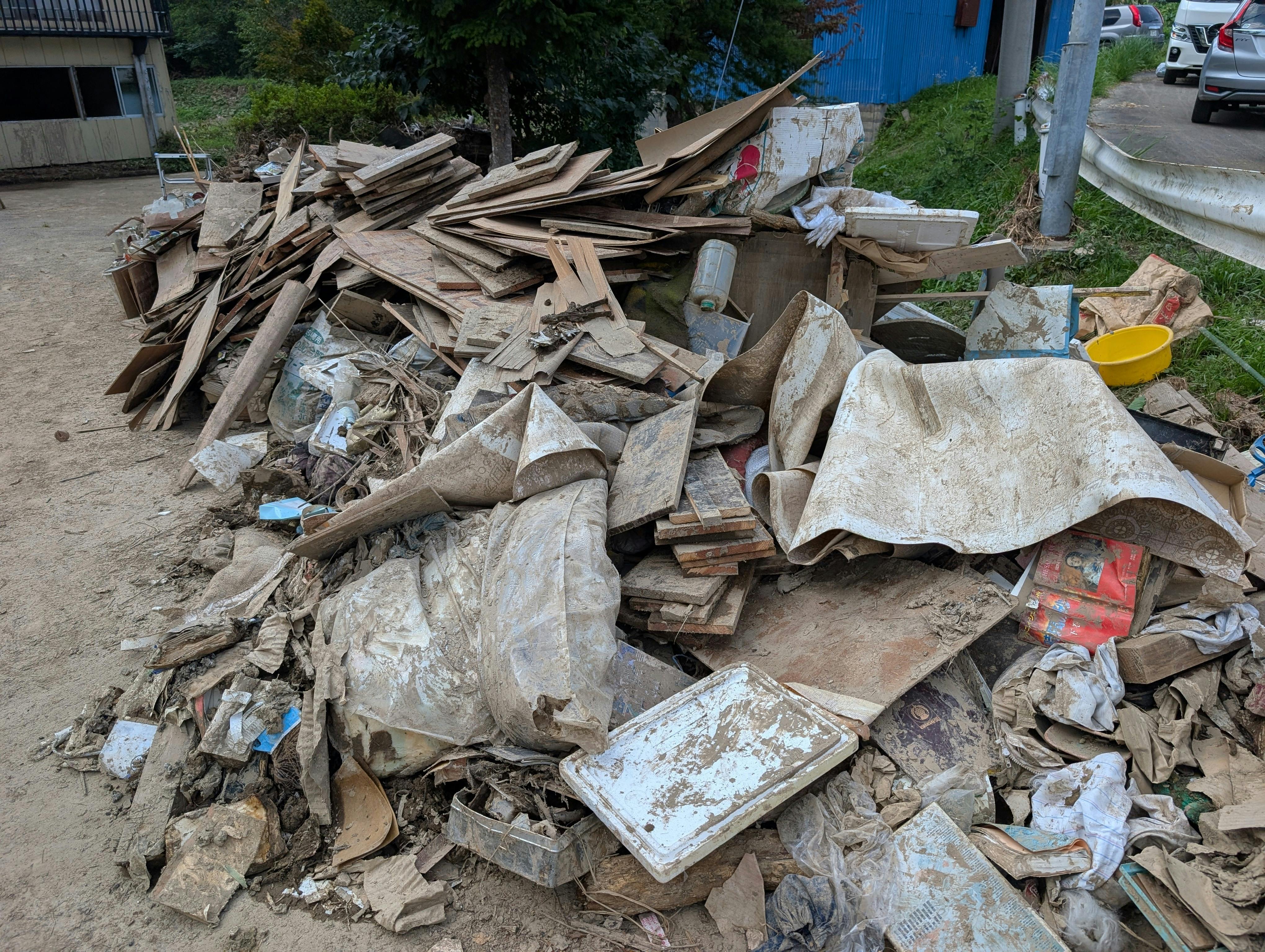 近年、毎年のように秋田県内は7・8月に豪雨災害が発生、今年こそは穏やかな天候で収穫の秋を迎えられますようにと願うのですが…8月19日から降り続いた大雨は、秋田県内でも大きな被害を及ぼしました。特に、仙北市上桧木内(かみひのきない)地区は浸水被害で家屋や田畑の被害が甚大で、断水となった地区もあり日常生活にも住民の皆さんは困難を抱えています。仙北市社会福祉協議会では災害ボランティアセンターを設置し23日から活動開始、知人が数名コーディネート役や現場作業に奮闘しています。北秋田市回りの国道105号線も通行止めが解除され、陣中見舞いと今後の活動の目星を付けるためにも、先日上桧木内地区を訪れました。泥まみれになった家財道具の片付け中断水により日々の煮炊きにも困難なため、元保育園だった施設では連日地元の団体、飲食店、近隣市町村の各種団体による炊き出しが行われています。中には遠く青森県から、3年前の水害で被害を受けた鰺ヶ沢町社協の皆さんがカレーライスを…。ありがとうございます!支援された側が、支援する側に回るというのは、これまでも全国各地での災害現場で見られた光景です。この体育館が、炊き出しの際には食事会場に炊き出し会場となる地区の交流施設は、元保育園だった施設だけに立派な調理場もあり、大型のガス台や炊飯窯なども常備、大がかりな準備をしなくても数名のスタッフと食材さえあれば十分炊き出しは可能!数珠つなぎで何とか炊き出しのリレーをつないできましたが、その調整と各団体の確保もなかなか困難なようで…、その後、能代市の飲食店さんが名乗りを上げてくれて、近日中に炊き出し決行することとなりました!微力ながら住民さんに体と心の栄養をつけて、この水害を乗り越えてほしいと願います。前田HCや田口キャプテンはじめハピネッツの皆さんこの日はあるお宅で作業中の、ずいぶん背の高い若者達のご一行が…プロバスケットボール・秋田ノーザンハピネッツの皆さん!泥まみれになりながら、家財道具の片付けや泥出しに精を出しておりました。その後、被災エリアに近い地元のお寺に立ち寄り、久々にお会いするご住職と現地の近況報告などよもやま話。檀家さんが被災された際に、菩提寺の住職としてのスタンスや声かけのあり方など、情報交換して帰路に就きました。炊き出し実施の様子は、またご報告したいと思います。今回発刊した『宝昌寺だより -白神山地の麓 藤琴川のほとりから-』の中では、阪神淡路大震災以降、新潟中越地震や中越沖地震、東日本大震災、昨年の能登半島地震、秋田県内での過去の災害時の体験や現地で感じたことなども綴りました。そちらもぜひご覧ください。