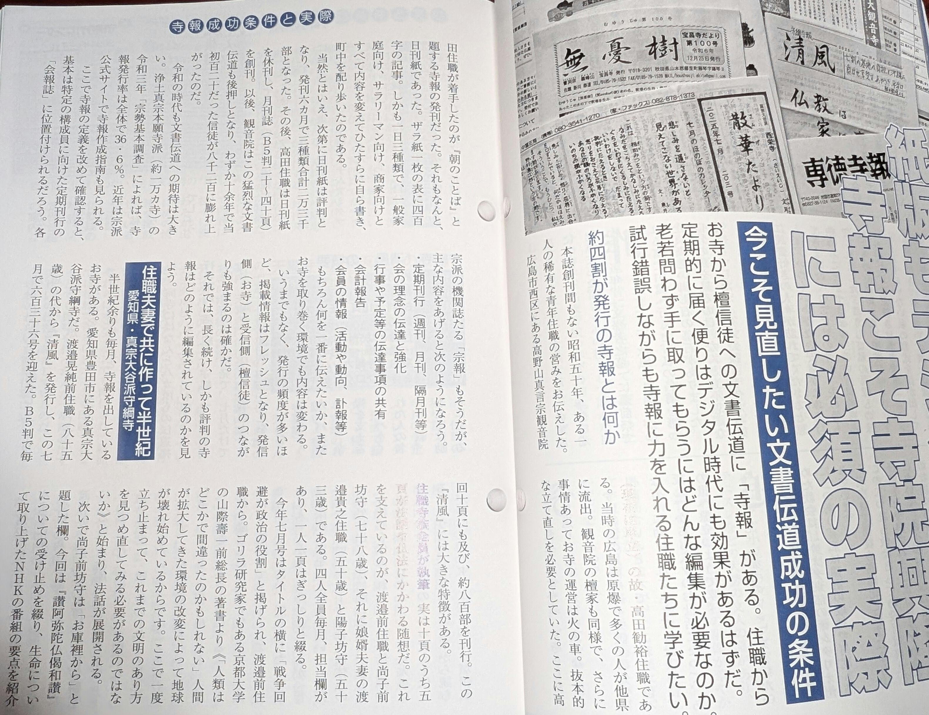 創刊50年余の歴史を持ち、我々の業界誌として知られる『月刊住職』、一般の方々にはそのネーミングからインパクトある月刊誌と思われているようです(^_^;近年は特集記事の見出しが攻めてる!神見出し!と度々各種メディアでも話題となり、バズることも…決して奇をてらった内容の誌面というわけではなく、寺院の現場を丹念に取材し、都市部から過疎地に至るまで困難な状況下でも奮闘する全国の和尚さんが実践している寺院の維持管理、布教のアイデア、学術的にも貴重な論文やデータ、時代の趨勢から寺院としても考えねばならない提言など、真面目な紙面作りに敬服しながら関心を持って読ませていただいております。今回、たまたま寺報に関する特集記事が組まれ、宝昌寺発行の『無憂樹(むゆうじゅ)』についても取材を受けました。各行事の案内や報告、経典や仏教語、仏事に関する解説といった定番の内容に加えて、この『無憂樹』では地域の各商店や企業の協賛広告が目を引いたようです。印刷費用の足しに…という点ももちろんありますが、記事内でも申しましたように仏事法要を控えている檀家さんにとって、この冊子を手に取ると関連する地元の業者やお店が網羅されており、お花や会食の料理、引き物、お墓の修繕などを手配する際の便宜を図るため、また地元商店への貢献という意図で掲載しています。長年、協賛広告を掲載していただき、この『無憂樹』発行を支えていただいている各商店や企業の皆様には感謝申し上げます。記事の中では『無憂樹』100号記念として今回発刊した『宝昌寺だより -白神山地の麓 藤琴川のほとりから-』についてもご紹介いただきました!ありがとうございますm(__)m他にも全国の寺院さんで発行されている寺報について紹介され、たいへん参考になる特集記事でした。