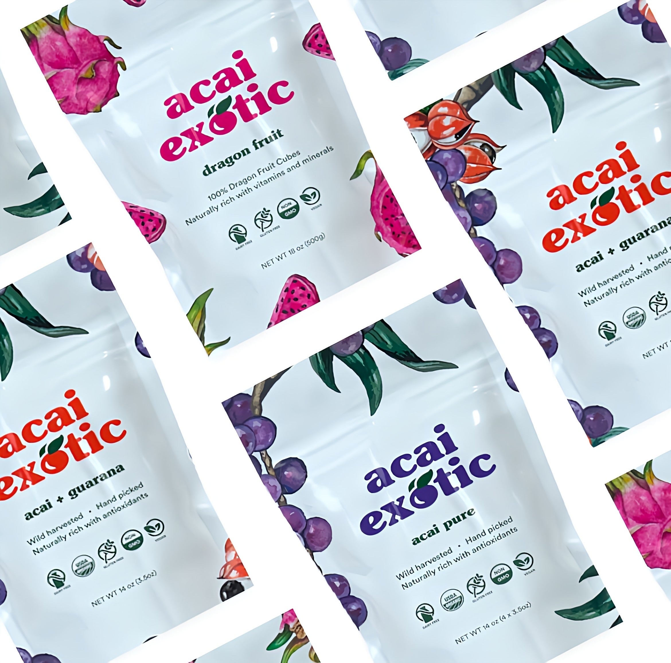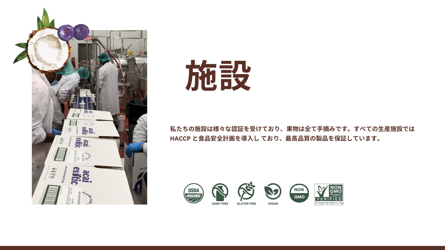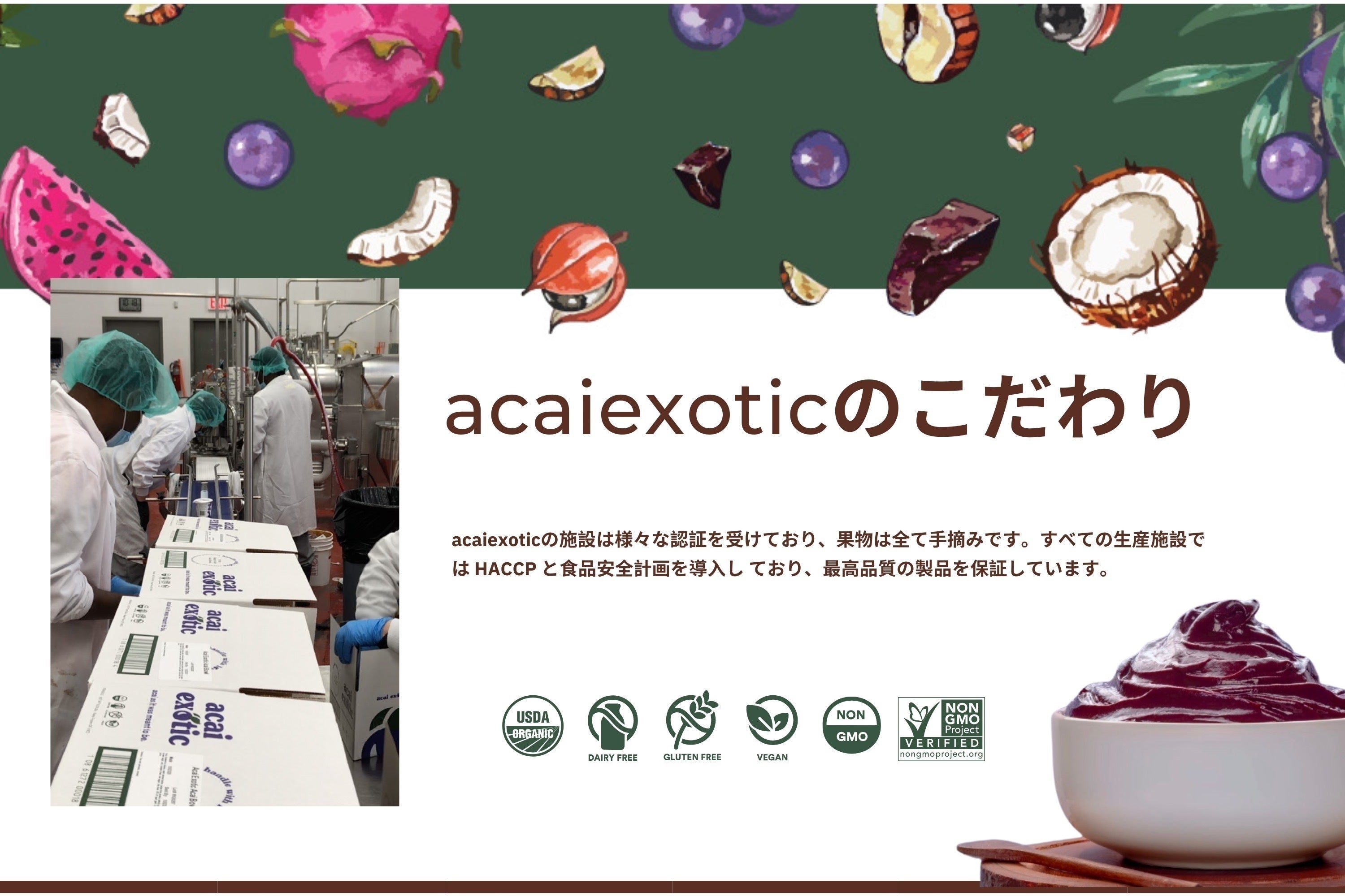 ・アサイーエキゾチックの製品はすべてオーガニック、コーシャ、ビーガン、乳製品不使用の原料で作られており、果物はすべて手摘みです。すべての生産施設では HACCP と食品安全計画を導入しており、最高品質の製品を保証しています。