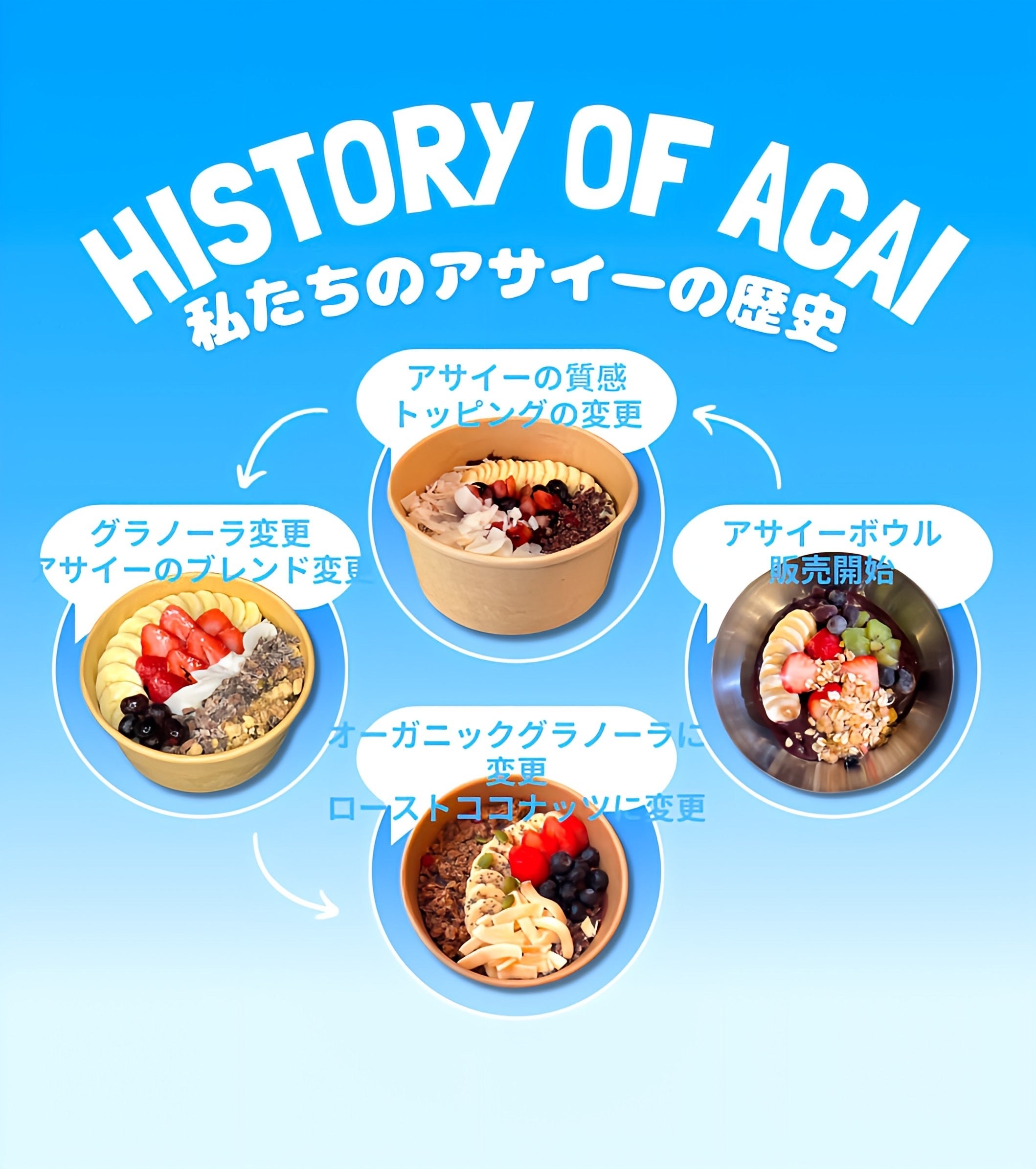 私たちはアサイーがトレンドになる前から販売をはじめ、店舗で何度も改良を重ねて本当に美味しいアサイーボウルを追究しています。