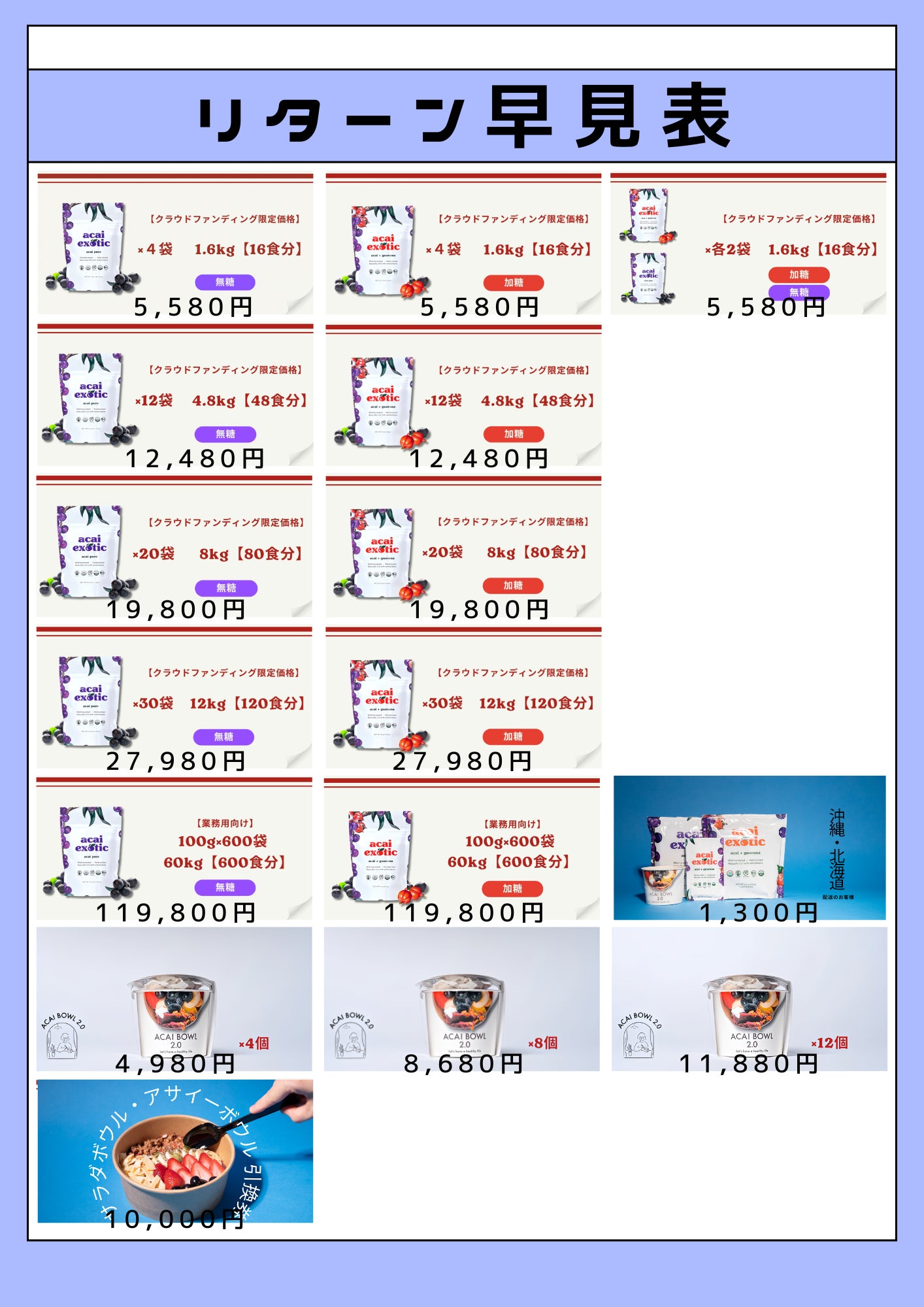 ・【クラウドファンディング限定価格】でアサイーピューレを販売させていただきます。1.6kg〜12kg、業務用(60kg)まで幅広くご用意させていただきました。