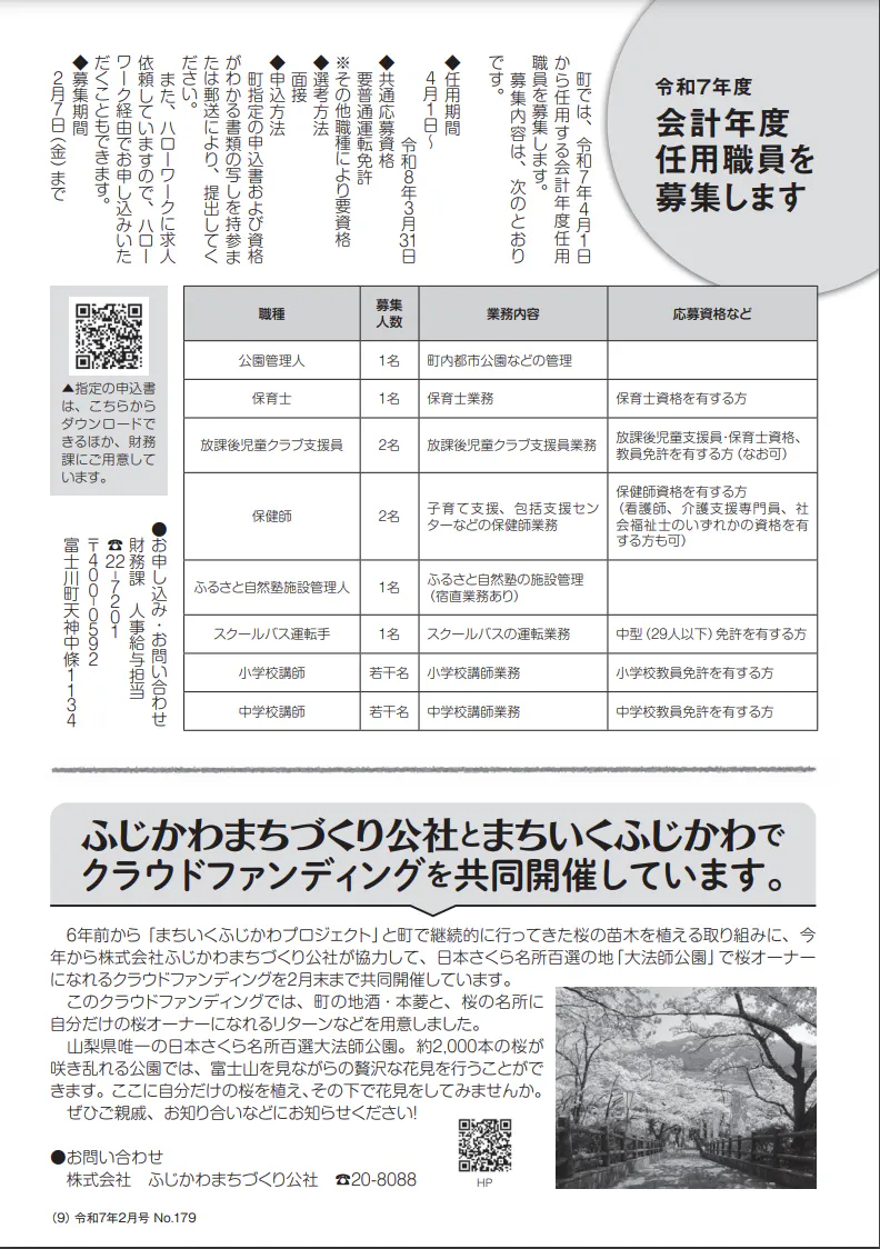 2025/01/29 07:01まちいくふじかわ発起人代表の深澤です。町の広報誌「広報ふじかわ」最新号にクラファンを取り上げていただきました。(広報誌は町のHPで見られます)思えば6年前から取り組み、今年で7回目。今年からは「ふじかわまちづくり公社」と協力してこの取り組みを行っております。(このプロジェクトも公社のIDにて行っております)大法師公園は、山梨県唯一の桜の名所百選です。富士山と桜でカンパイ!しましょう! もっと見る