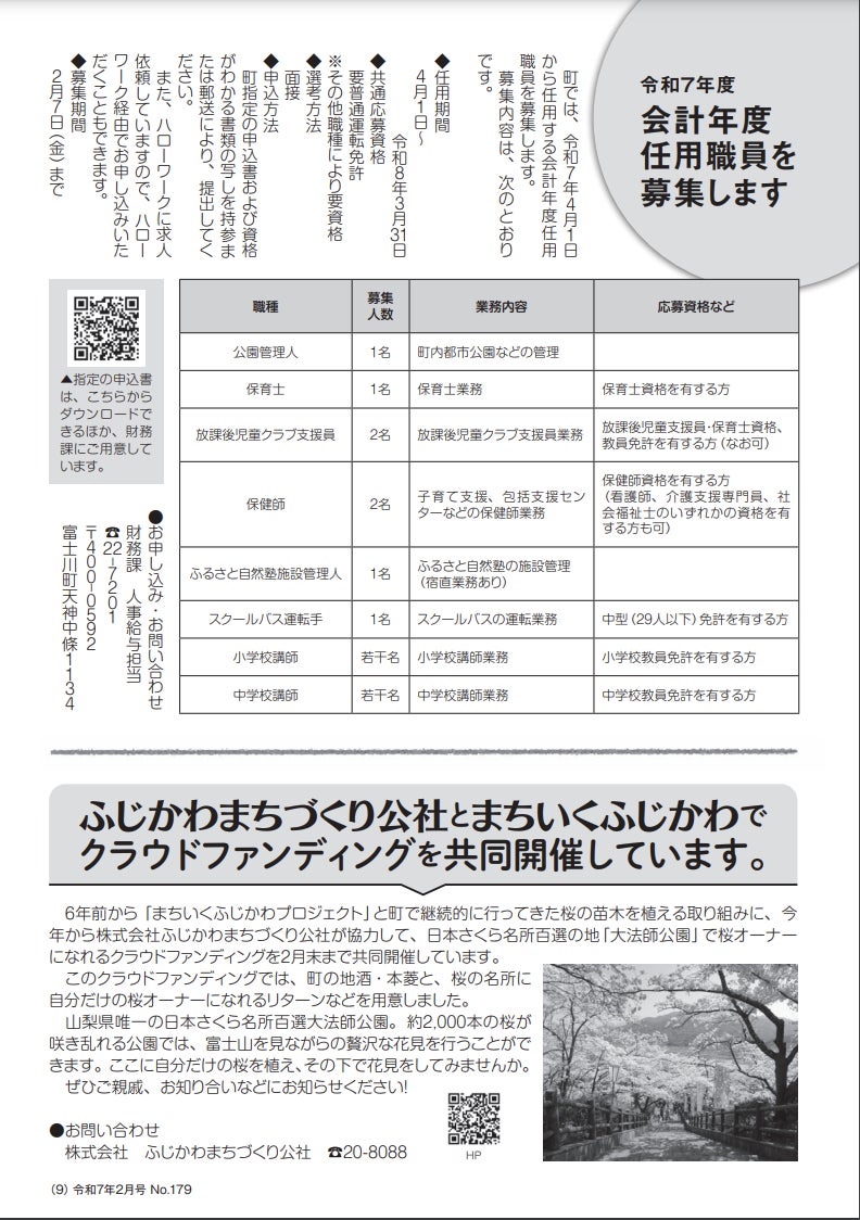 まちいくふじかわ発起人代表の深澤です。町の広報誌「広報ふじかわ」最新号にクラファンを取り上げていただきました。(広報誌は町のHPで見られます)思えば6年前から取り組み、今年で7回目。今年からは「ふじかわまちづくり公社」と協力してこの取り組みを行っております。(このプロジェクトも公社のIDにて行っております)大法師公園は、山梨県唯一の桜の名所百選です。富士山と桜でカンパイ!しましょう!