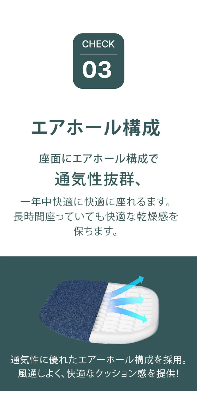高密度クッションがお尻と腰を支えて正しい姿勢に導きます!