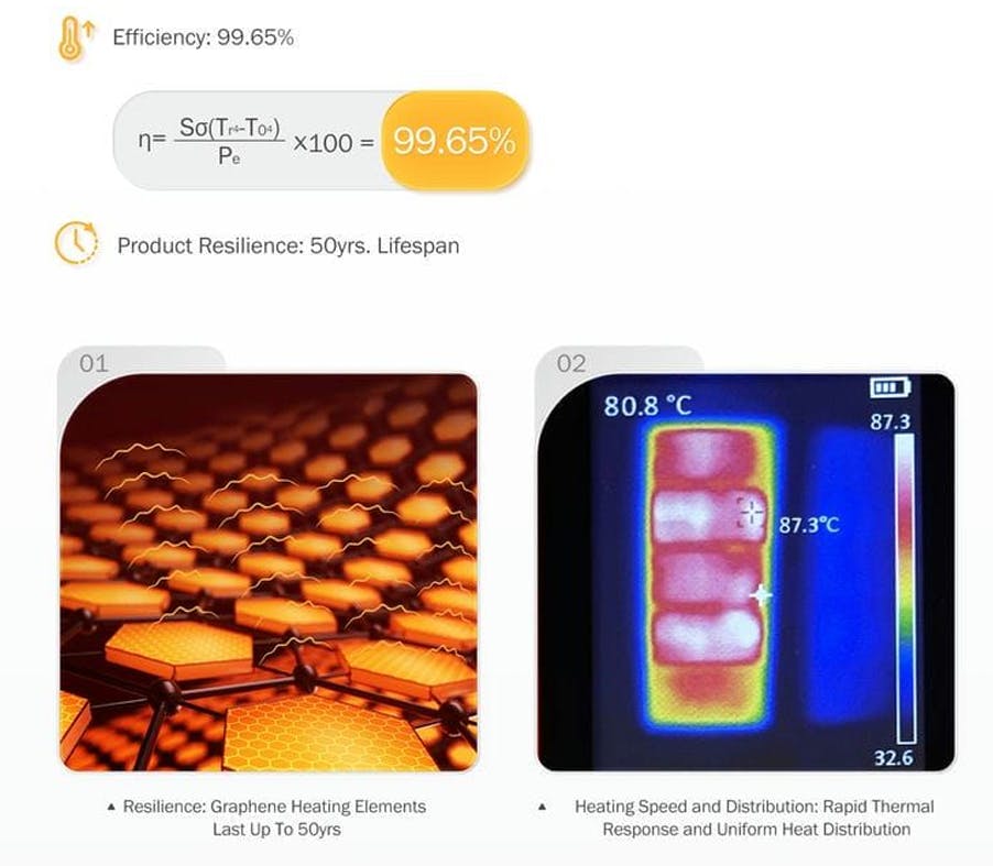 グラフェンの強固な構造は、ヒーティングパネルが従来のヒーターよりも摩耗や損傷に強く、長寿命を実現します。