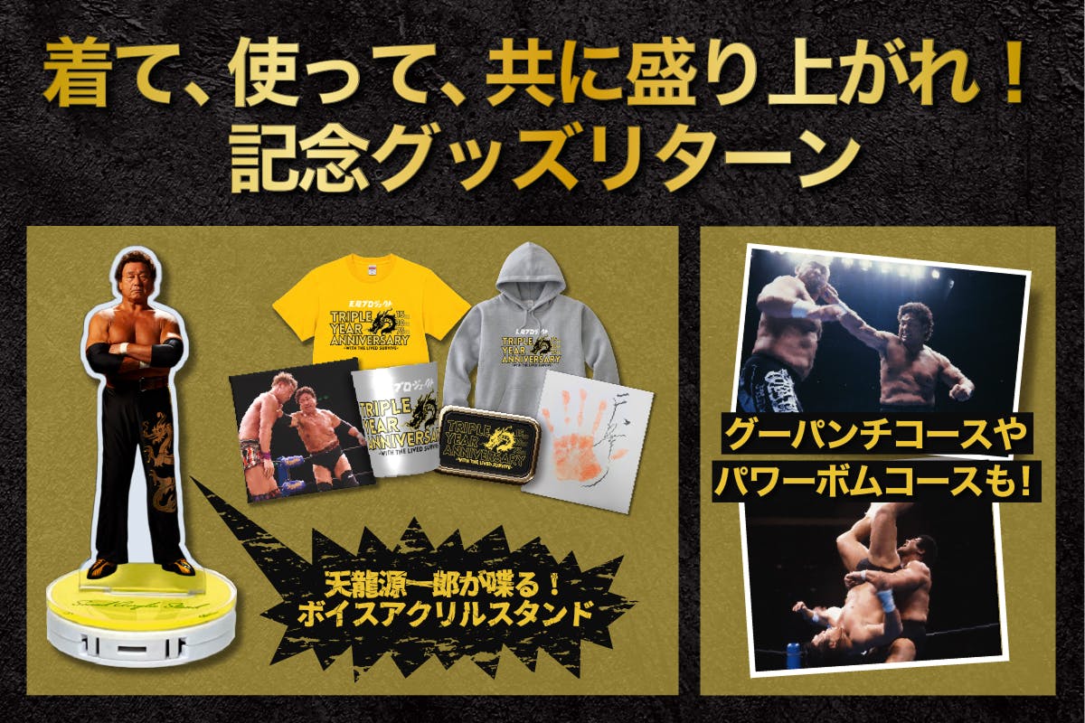 1.お礼メール / 2.引退試合パンフレットトリプルイヤー特別版(名前掲載) / 3.天龍源一郎が喋る!ボイスアクリルスタンド / 4.トリプルイヤー限定Tシャツ / 5.トリプルイヤー限定パーカー / 6.トリプルイヤー限定ピンバッチ