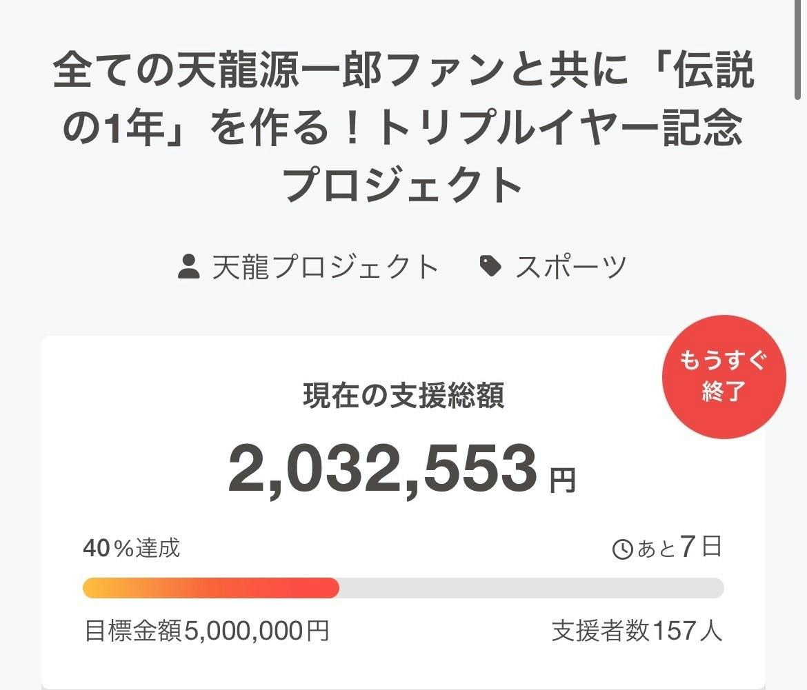 天龍源一郎 “トリプルイヤー” クラウドファンディング、残り5日となりました。これまで多くのご支援を賜り、心より御礼申し上げます。このたび、最後のお願いとして、天龍プロジェクト代表・嶋田紋奈が今の率直な想いをnoteに綴りました。どうしてもお伝えしたいことがあります。天龍プロジェクトの歩み、家族としての想い、父・天龍源一郎を守りたいという強い気持ち、そして──なぜ、今クラウドファンディングを行っているのか。お時間のあるときに、ぜひお読みいただけたら嬉しいです。noteはこちらからhttps://note.com/ayana_tenryu_pj/n/nccd3d36ce346?sub_rt=share_sb