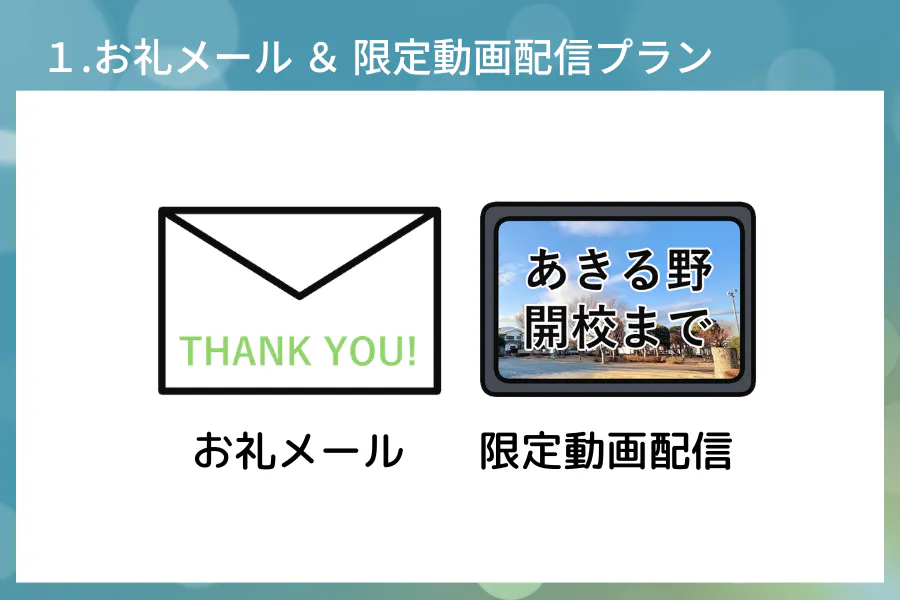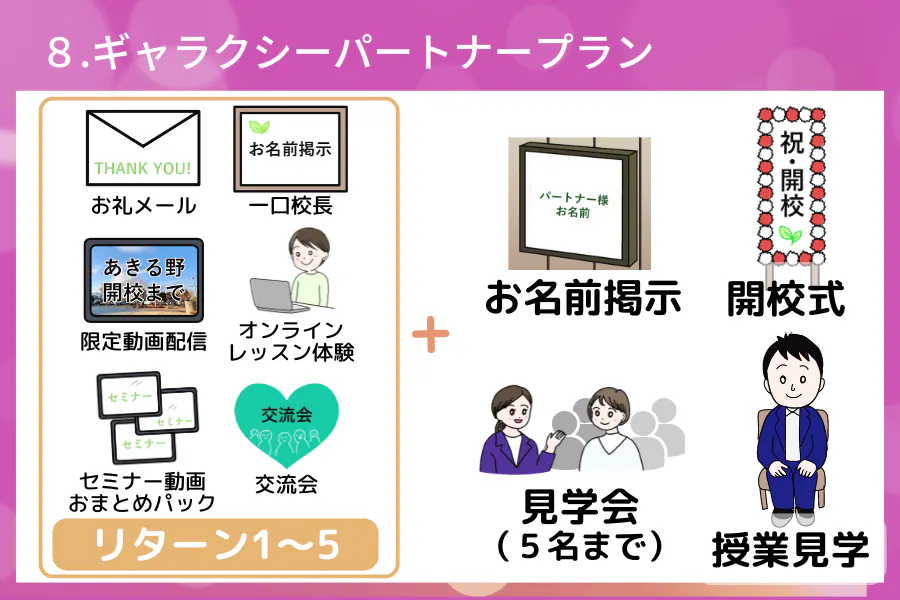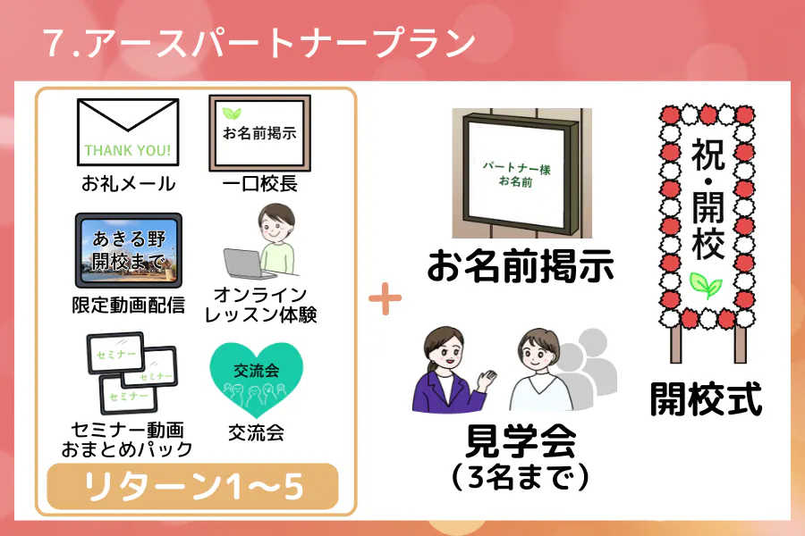 \1~5のリターン全て&玄関ホールお名前掲示&スクールの施設見学会にご招待致します/