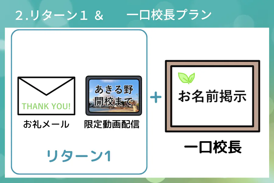 \1~5のリターン全て&玄関ホールにお名前を掲示&施設見学会&小学校の開校式&授業見学にご招待/