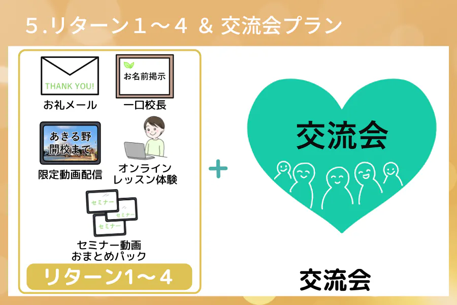 \ここまでの全てのリターンに加え、交流会イベントにも参加できる大変お得なプランです!/