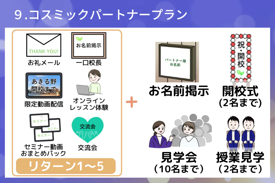 【9. コスミックパートナープラン 〜未来の教育の発展への全力応援〜】 1,000,000円