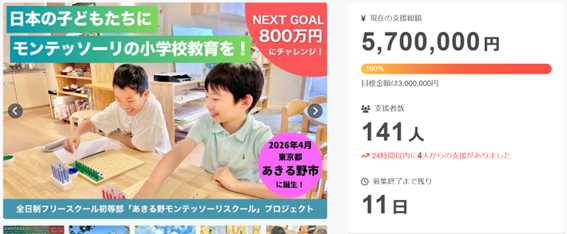 すでにご支援くださった皆様にも、あきる野モンテッソーリスクールとこのプロジェクトに関わる者たちの熱い想いを共有し、「支援してよかった」と感じていただけたら嬉しいです。