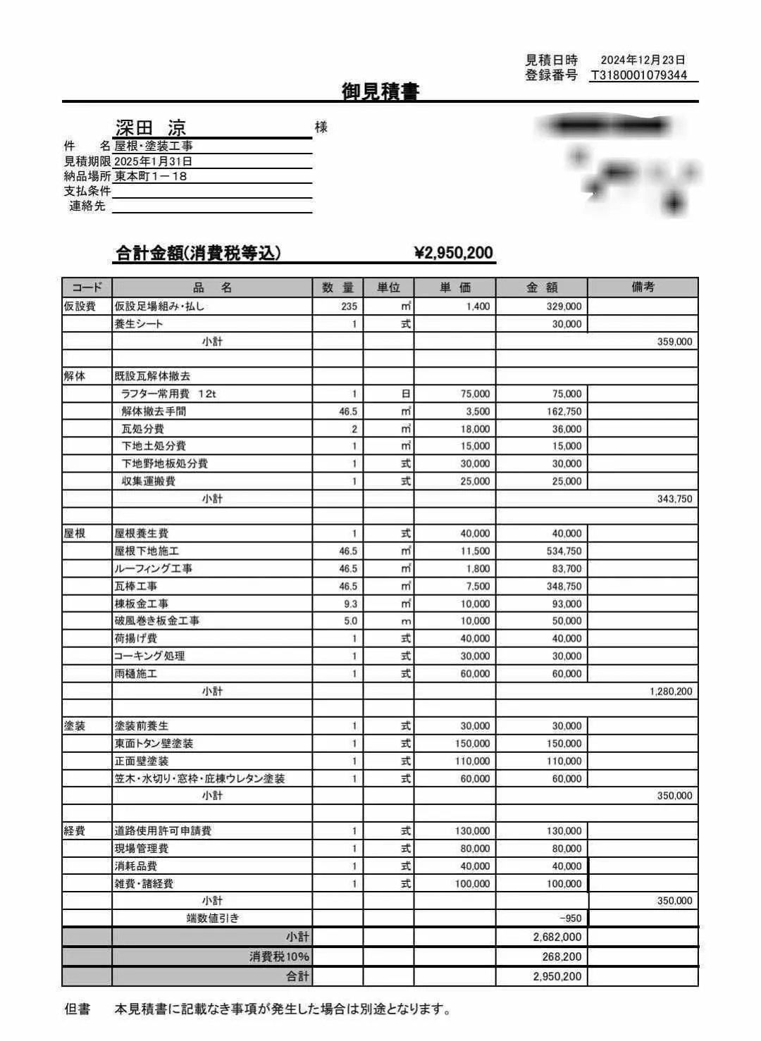 下記が現在予定している業者さんが出した見積もりです。