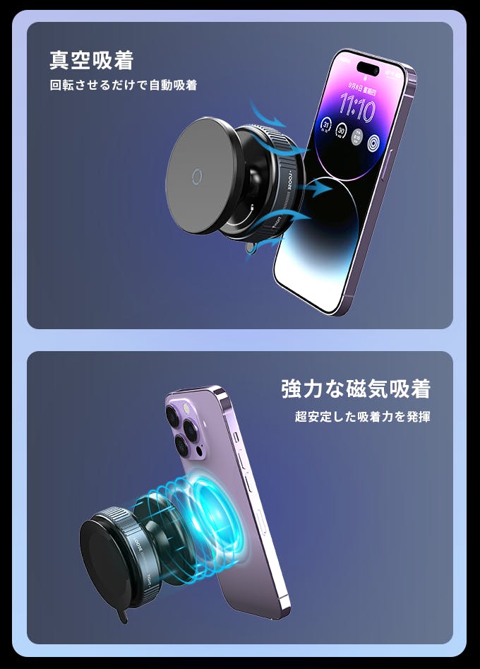 マグネットによる吸着方式も採用しているため、電力を消費せず、充電などの煩わしい操作も一切不要です。スマホを円盤に置くだけでパッと固く吸着します。