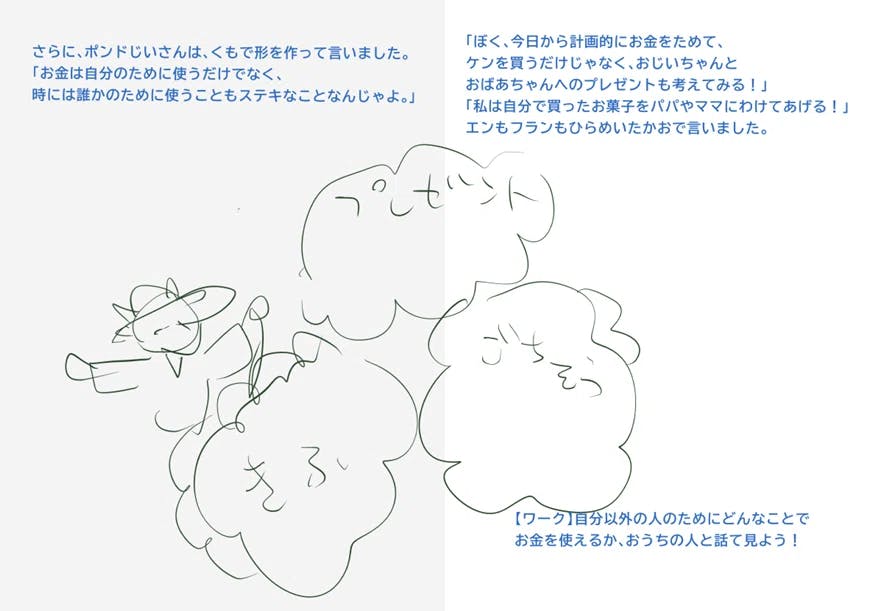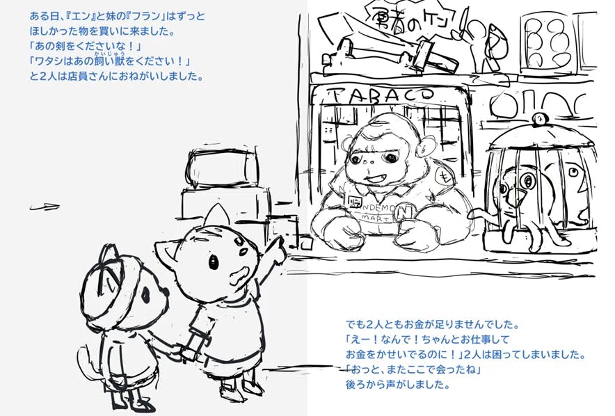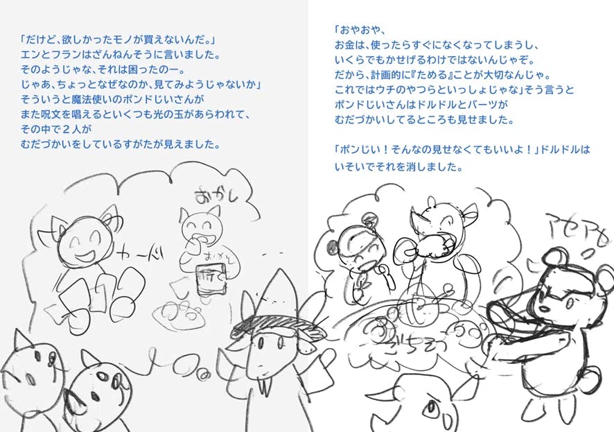 絵本の内容について、塚本俊太郎さまと打ち合わせ、絵本作家のおーつぼっくすさまにラフを描いていただいています。