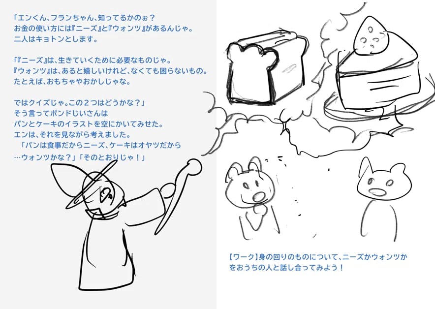 ポンドじいさんのお金の講義が始まります! 大人にもぜひ意識してほしい「ニーズ」と「ウォンツ」のお話です。