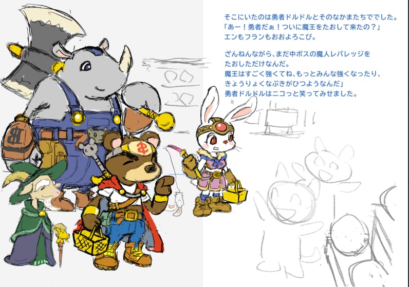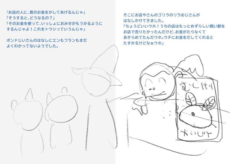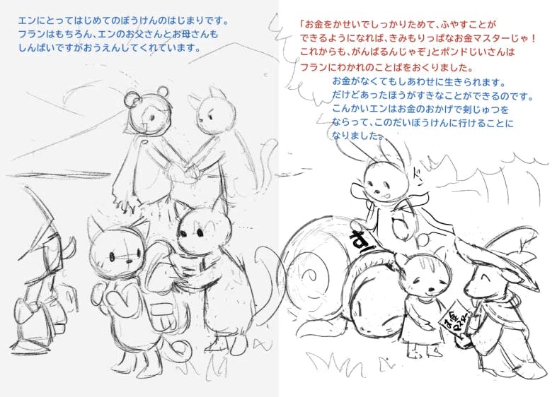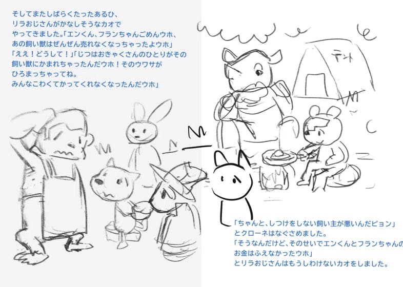絵本の内容について、塚本俊太郎さまと打ち合わせ、絵本作家のおーつぼっくすさまにラフを描いていただいています。
